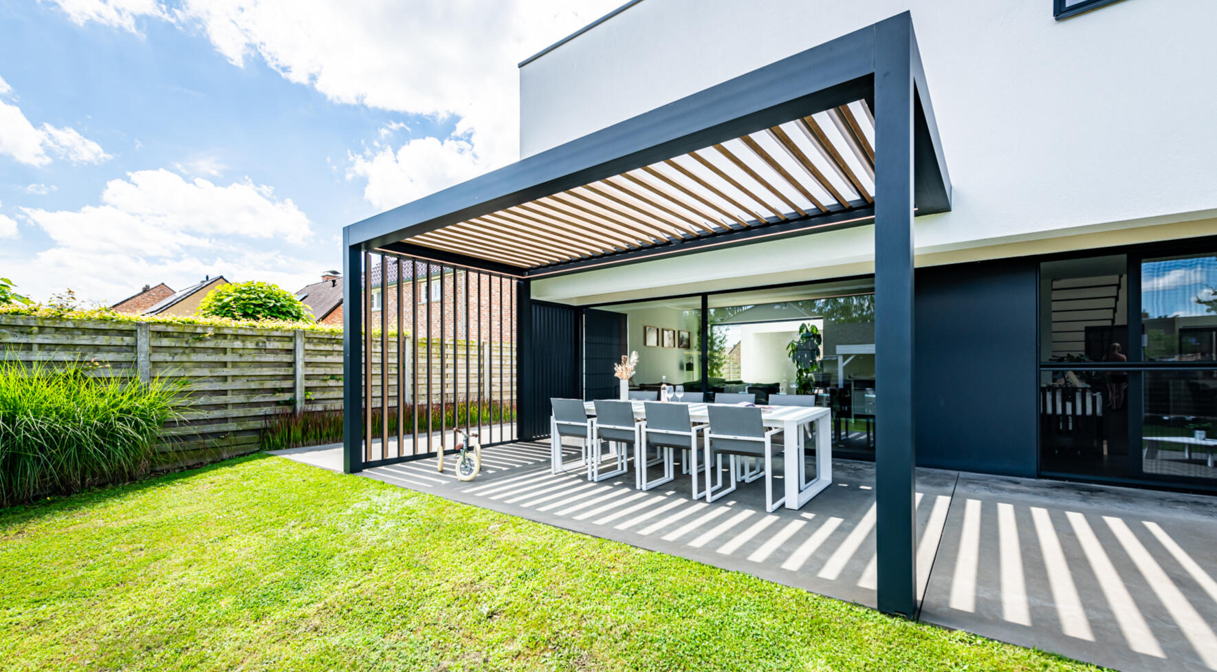 - Pergola Z!P à toit incliné pour évacuation optimale de la pluie.